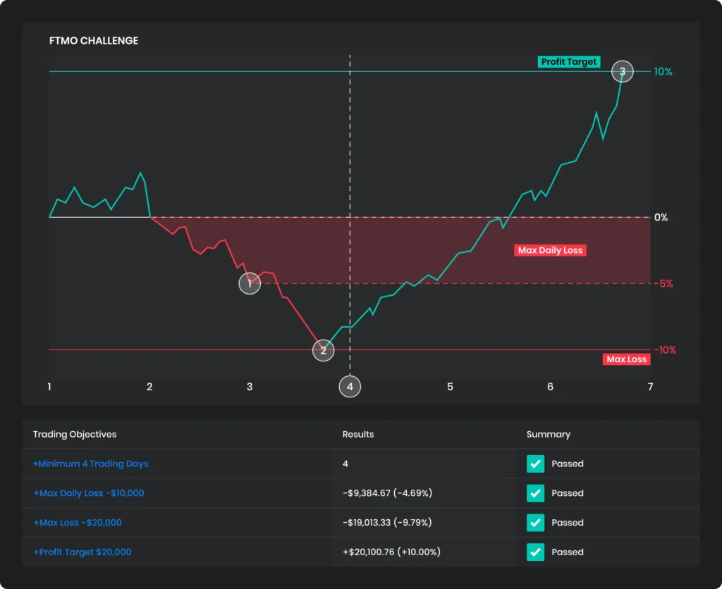A FTMO criou um Processo de Avaliação rigoroso — Challenge + Verification — projetado para identificar traders verdadeiramente consistentes. Quem demonstra habilidade e disciplina é convidado a operar uma FTMO Account com capital simulado de até US$ 200.000, recebendo até 90% dos lucros gerados, tudo sem arriscar dinheiro próprio.